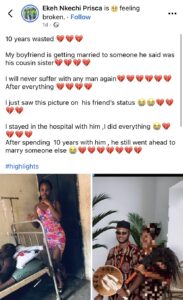 “10 years wasted… My boyfriend is getting married to someone he said was his cousin sister,” she wrote, expressing regret and anger over what she described as years of emotional and practical support.